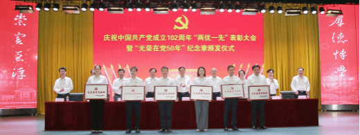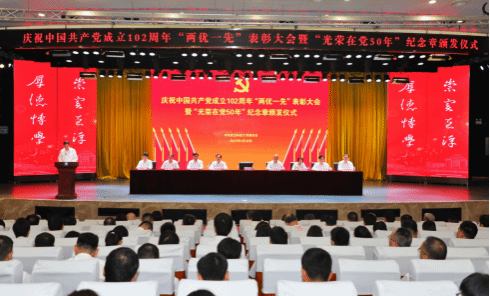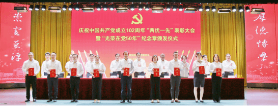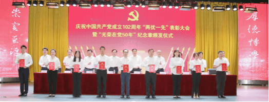党委常委、组织部部长刘时新同志宣读有关文件。25名党员获“光荣在党50年”纪念章,50个基层党组织获得“先进基层党组织”称号,60人获得优秀共产党员”称号,50人获得“优秀党务工作者”称号。