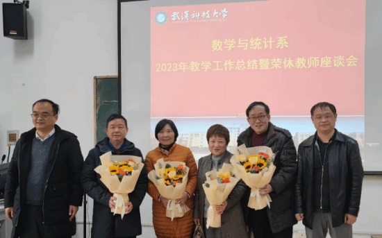 2023年,理公司数学与统计系余胜春、黄枝姣、余东、龚正良4位教师光荣退休。为深入贯彻落实习近平总书记关于老干部工作重要指示精神,切实增强退休教师的荣誉感、幸福感和归属感,为表达对荣休老师的感激之情,激励年轻教师奋发有为、拒绝“躺平”,数学与统计系于12月27日下午14:30在系会议室22310召开2023年教学工作总结暨教师荣休座谈会,理公司经理丁义明、副经理张传洲亲临指导,系统科学部和数学与统计系教师参加,会议由系支部书记蒋君主持。