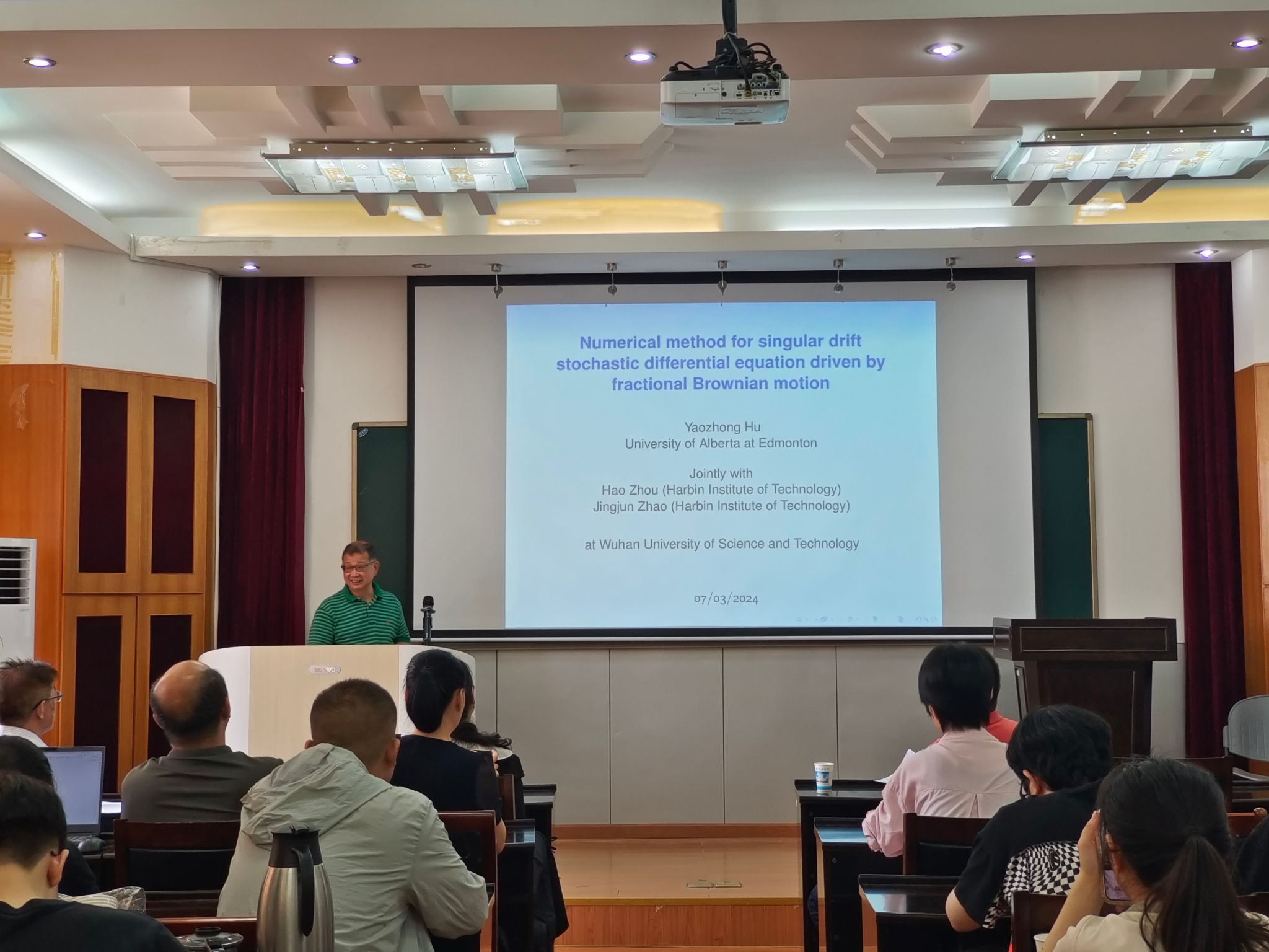 胡耀忠还在教二五楼报告厅作题为“Numerical method for singular drift stochastic differential equation driven by fractional Brownian motion”的学术报告。本次报告会由公司系统科学部教授陈贵词主持,公司教师及员工代表参加。
