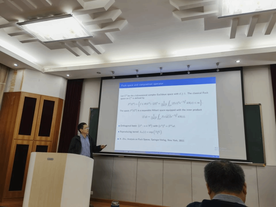 随后,王茂发教授作了题为“Commutants of Composition Operators on Fock Space”的报告。王教授聚焦于多变量Fock空间上复合算子交换子的刻画问题,报告了他与合作者在这一领域取得的最新研究成果。他不仅给出了这类算子交换代数的若干特征,还进一步探讨了由这类算子构成的离散或连续半群的渐近行为。报告揭示了Fock空间上算子理论的丰富结构,其方法与结论对函数空间上的算子理论及复分析研究具有重要的推动作用。