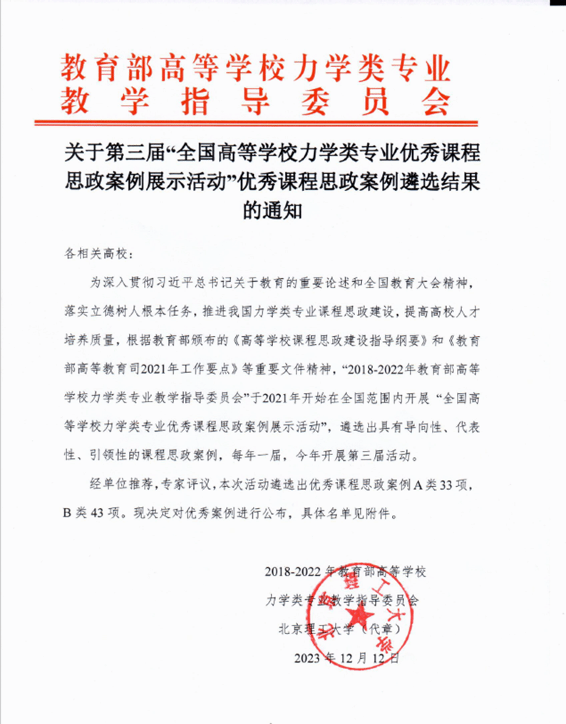 近年来,公司工程力学系全面贯彻党的教育方针和全国高校思想政治工作会议精神,围绕公司“立德树人,教书育人”的根本任务,结合工程力学学科特色和新时代背景,大力推进课程思政进教材、进课堂、进头脑,深入贯彻“价值塑造+知识传授+能力培养”三位一体的育人理念,并培养了一批课程思政建设的骨干教师。本次案例的入选,是工程力学系课程思政建设的又一个阶段性成果,是工程力学系持续加强课程思政改革创新工作的新起点。