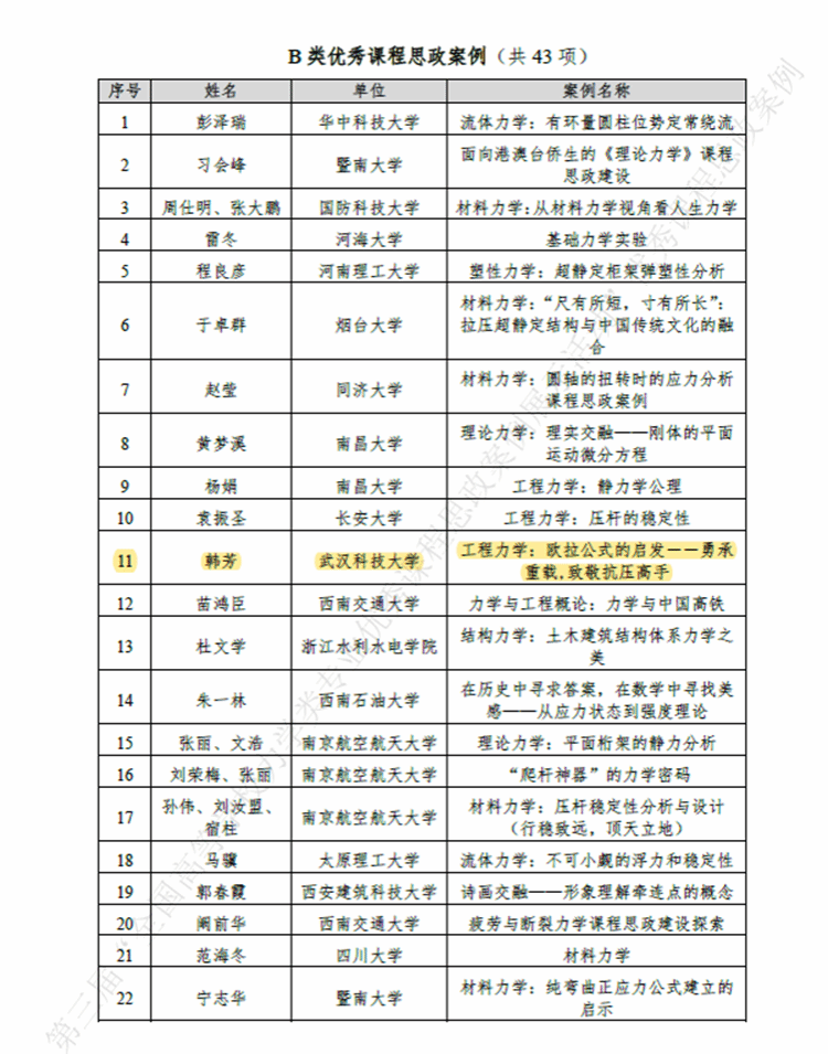 12月14日,从教育部高等公司力学类教学指导委员会获悉,公司工程力学系韩芳副教授的课程思政案例入选第三届“全国高等公司力学类专业优秀课程思政案例展示活动”优秀课程思政案例。经单位推荐、专家评审,本次活动共遴选出优秀案例A类33项,B类43项。工程力学系韩芳老师的“工程力学:欧拉公式的启发——勇承重载,致敬抗压高手”被评为B类优秀案例。本次遴选湖北省高校仅有2项入围,公司1项。