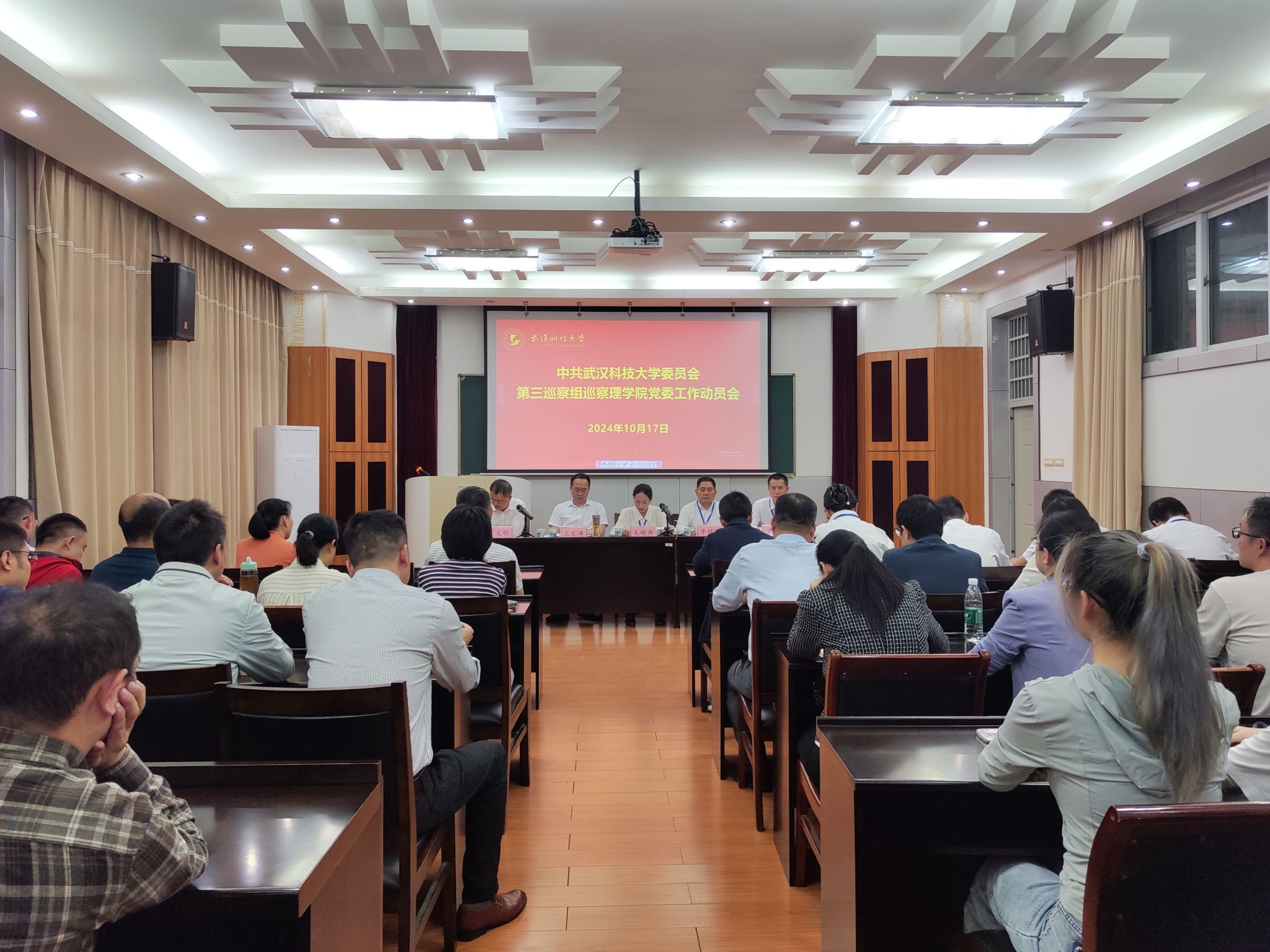 根据公司党委统一部署,10月17日下午,党委第三巡察组巡察理公司党委工作动员会议在黄家湖校区教二楼22515报告厅召开。党委第三巡察组组长毛晓丹出席并作动员讲话,理公司党委书记王文涛作表态发言。党委第三巡察组副组长李猛刚、雷鸣,第三巡察组全体成员,理公司领导班子成员参加会议,公司科级以上干部、系部主任、支部书记、教授代表及员工代表列席会议。大会由公司经理丁义明主持。